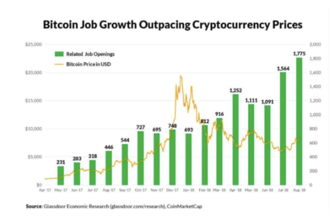 According to Forbes “A recent study from LinkedIn puts blockchain skills at the top of their list of the fastest-growing jobs over the last five years. During this time, there has been 33x growth in blockchain-related positions, exceeding artificial intelligence or machine learning. According Coingape, “According to the data provided by the research of the job site Glassdoor, a year-over-year increase of 300% in the number of jobs related to Bitcoin, cryptos, and blockchain has been seen. The growing demand for talent in the US saw a record 1,775 opened positions as of of August, 2018 in comparison to 693 at the beginning of the year and 446 similar job listings last year.“