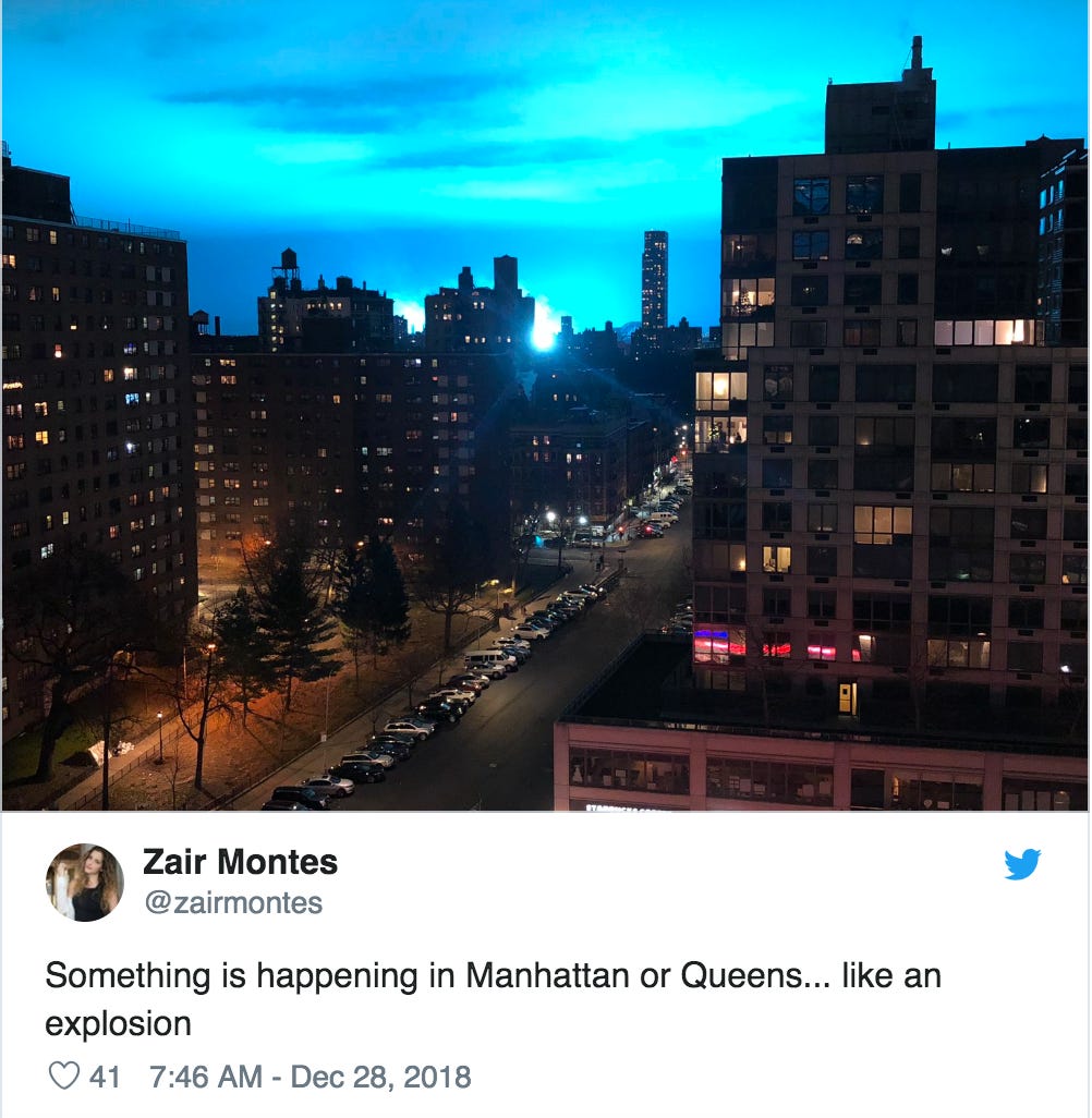 56 minutes ago from writing this, NYC exploded and the sky turned blue. Many people were afraid that aliens were coming to NYC and it is the end of the world as we know it. The airport also was completely black in LGA from power loss and we contacted the mayor directly for advise to assist in what was going on.